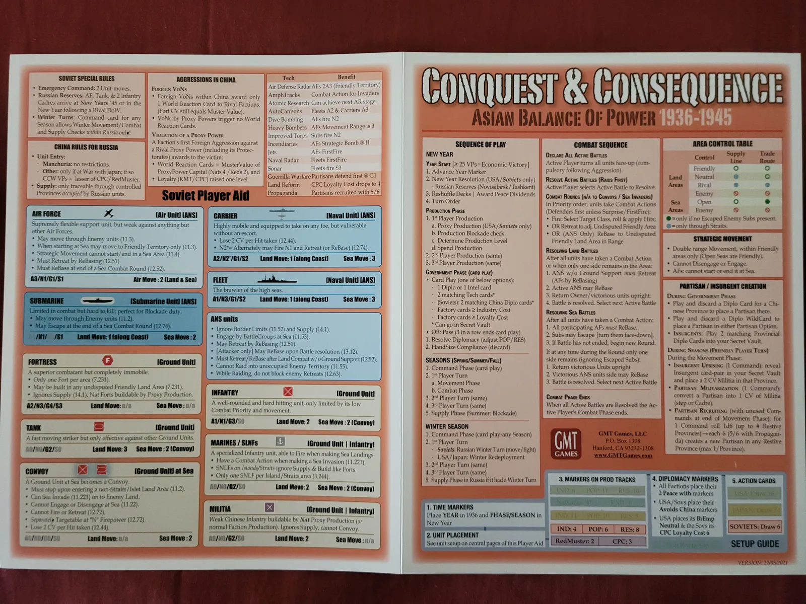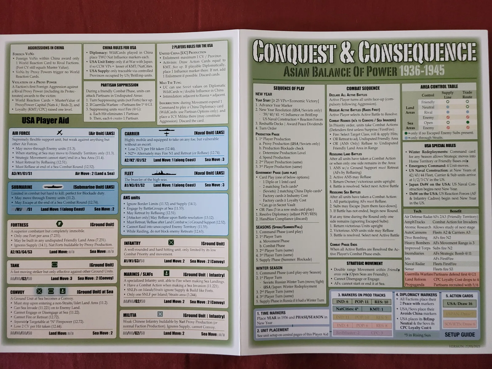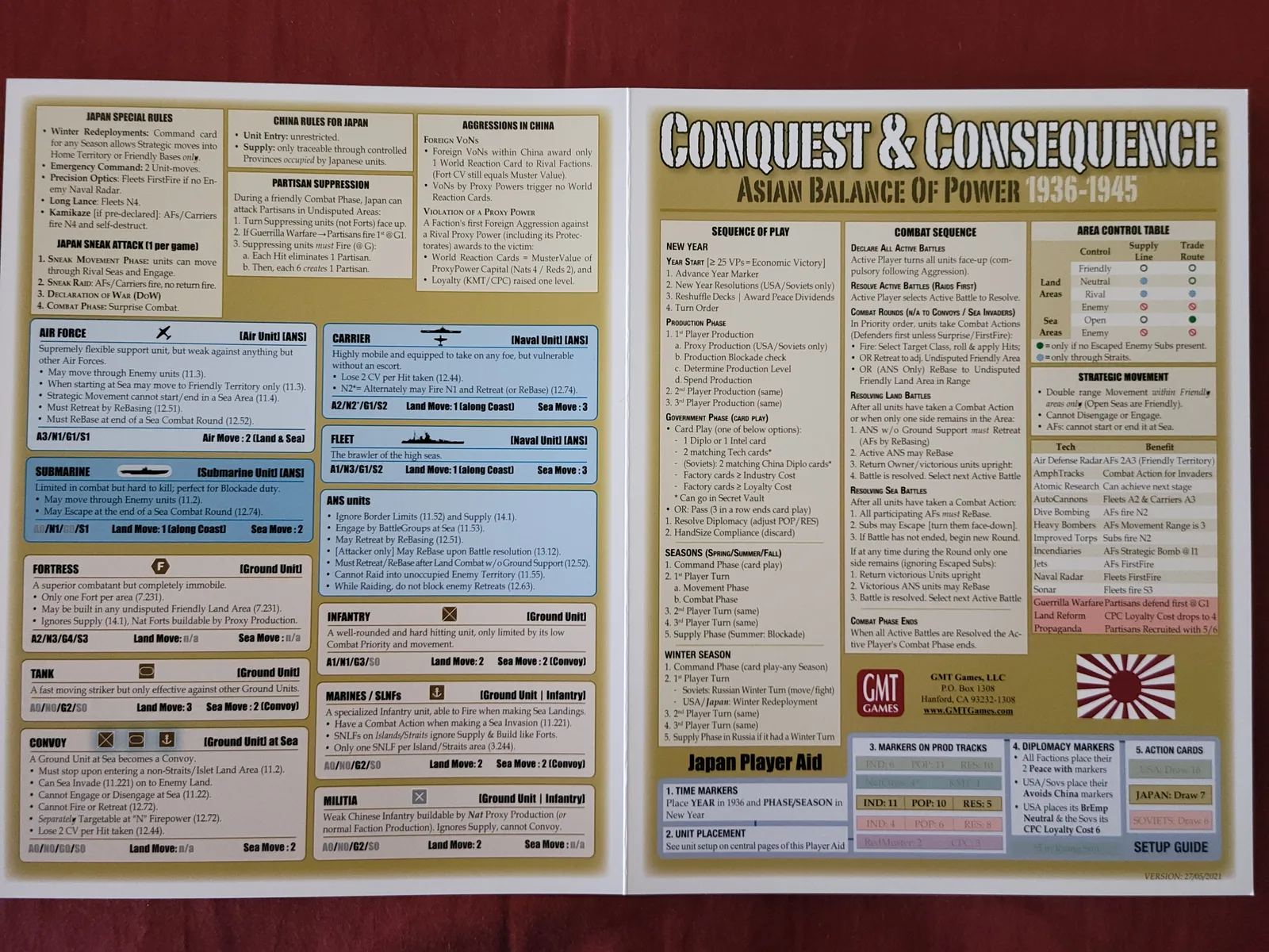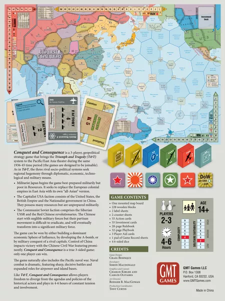 Conquest and Consequence brings the Triumph & Tragedy system to the Pacific/East Asia theater during the same 1936-1945 time period. Like T&T, it is designed for three players, maintaining the three-sided dynamic that adds so much variety and intrigue to the system. Those three sides are: