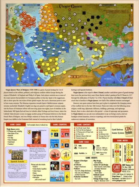 Virgin Queen: Wars of Religion 1559-1598 is a game of grand strategy for two to six players based on the military, political and religious conflicts within Europe during the reigns of Elizabeth I of England and Philip II of Spain. Each player controls one or more of the major powers that presided over European politics in that day. Spain is the juggernaut, able to draw upon the vast riches of their global empire. But such a dominant power is sure to have many enemies. The Ottoman expansion towards Spain’s Mediterranean outposts remains unchecked. Elizabeth’s English sea dogs are poised to raid Spain’s overseas empire. And the forces of Protestant reform will soon drag Spain into eighty years of rebellion in the Netherlands. Will Spain find aid from its Catholic allies? Perhaps not from France, where the Catholic Valois dynasty is soon to engage another group of Protestant believers in the bloody French Wars of Religion. And even Philip’s relatives in Vienna who rule the Holy Roman Empire may dabble in the Protestant faith instead of remaining loyal to their Catholic heritage and Spanish brethren.